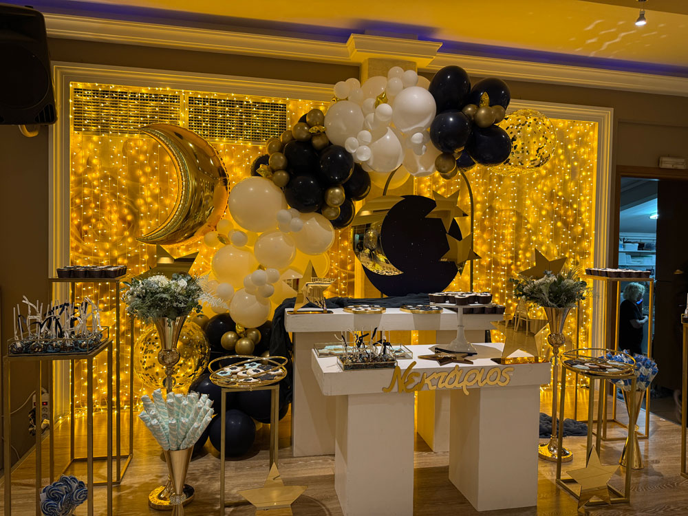 Στο κέντρο της αψίδας δέσποζε το βασικό σύμβολο του θέματος: ένα χρυσό μπαλόνι-φεγγάρι, πλαισιωμένο από μικρά χρυσά αστεράκια. Διάφανα μπαλόνια με χρυσό κομφετί πρόσθεταν πολυτέλεια, ενώ φωτάκια LED θερμού φωτισμού ολοκλήρωναν το παζλ μιας πραγματικά επιτυχημένης διακόσμησης βάπτισης.