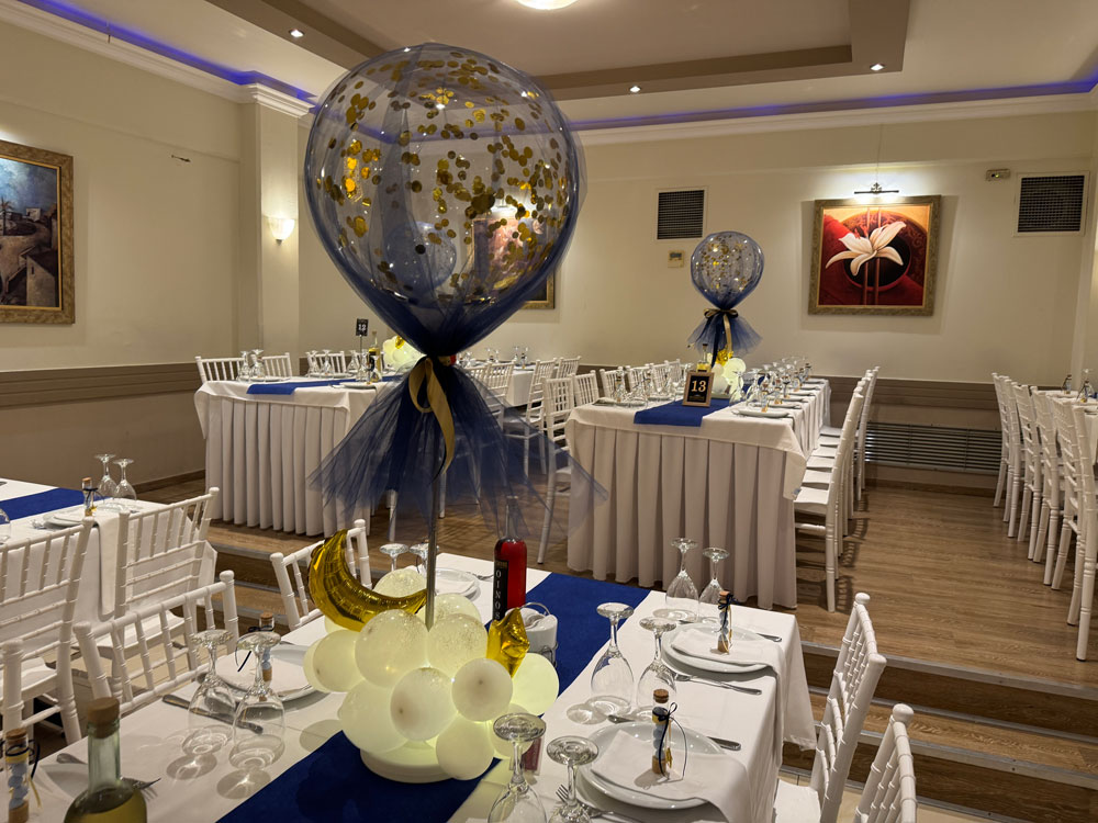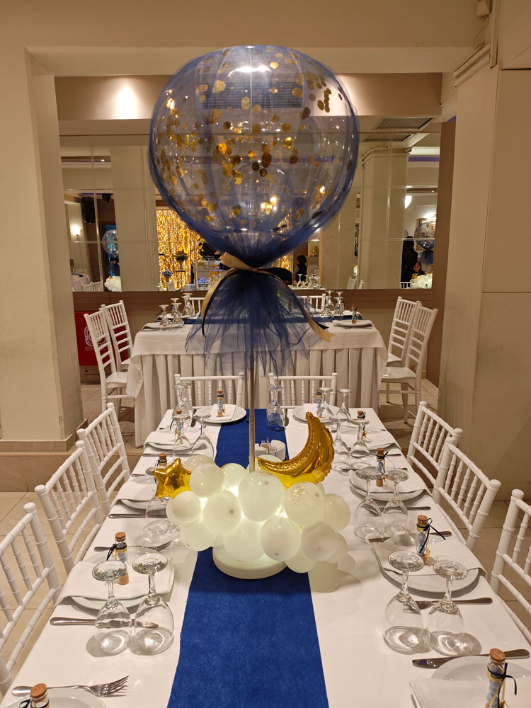 Στη βάση υπήρχε μπαλόνι-αστέρι και κρυμμένος φωτισμός LED που πρότεινε η Balloon Fire για να κάνει τη διαφορά. Έτσι, κάθε τραπέζι στη βάπτιση του Νεκτάριου είχε προσωποποιημένα μπαλόνια ειδικά για τη συγκεκριμένη εκδήλωση.